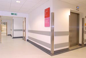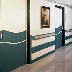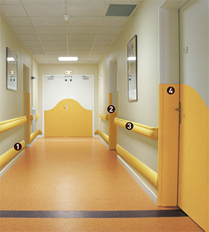 All public buildings have similar difficulties: premature deterioration together with wear and tear of their premises. Corridor walls, corners and doors are constantly knocked by trolleys and are damaged by continuous pedestrian traffic. All products are resistant to impact, germs and cleaning products. They are made from color impregnated material therefore color will not alter with cleaning or time.